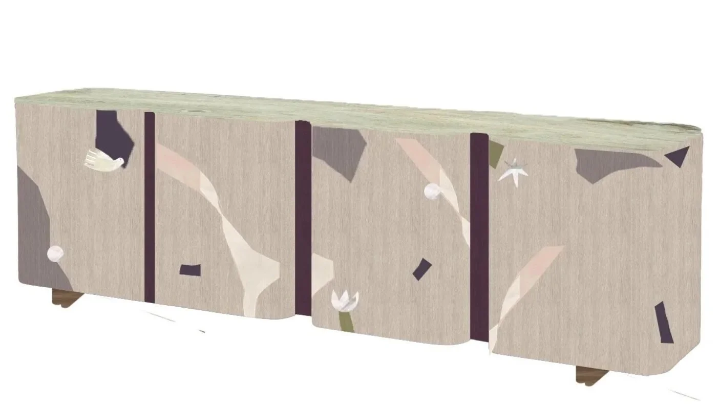 Material: Verde Fantasia Marble top; front in tinted wood inlay marquetry & mother-of-pearl inserts.