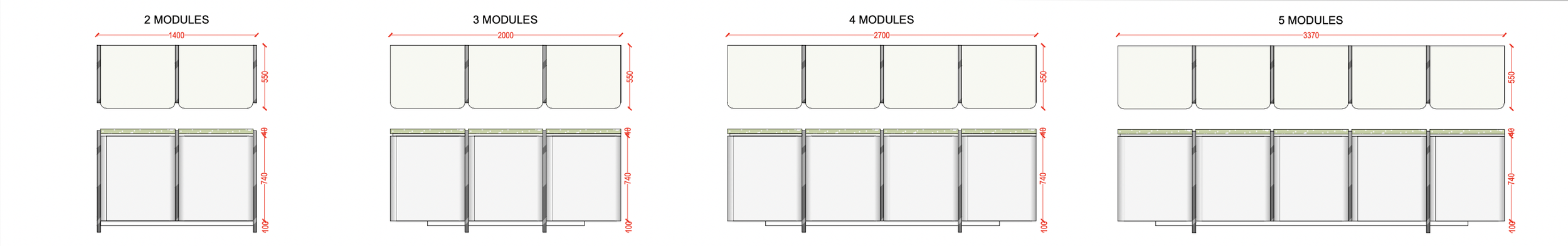 2 modules: W 1400 | 3 modules : 2000 | 4 modules : 2700mm. | 5 modules : 3370m